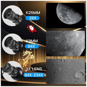 Presente poderoso de dia dos pais 28X 233X Este telescópio refrator está equipado com uma longa distância focal de . Vem com oculares K9mm e K25mm melhor que a ocular da série H, uma lente Barlow 3x e pode alcançar uma ampliação de surpreendentes 28 a 234 vezes. O escopo do localizador 5x20 torna a localização de objetos fácil e precisa. Um presente de aniversário exclusivo para ele, seu pai, papai, avô, pai em baixo ou padrasto. Presente de astronomia com óptica superiorO telescópio para adultos possui uma distância focal de e abertura de . A lente objetiva de coleta mais luz do que o telescópio de , e , então a imagem parece mais brilhante na ocular. um presente de agradecimento atencioso Tripé ajustável e lente Zenith rotativa de 360Fornece um tripé ajustável estável e atualizado, permitindo uma variedade de posições de visualização diferentes, proporcionando uma excelente experiência de observação. Os recursos que destacam o telescópio de são a lente Zenith rotativa de 360 patenteada, permitindo que adultos e crianças assistam com mais conforto. Um presente surpresa de Dia dos Pais da esposa, filha, filho Capturar momentos incríveisO telescópio iniciante para adultos vem com um adaptador de telefone universal e controle remoto sem fio, que é um bom auxiliar para tirar fotos, vídeos e gravar. Quando observamos as crateras da lua e a vida selvagem na natureza, podemos capturá los e compartilhá los com nossa família e amigos. Fácil de configurar e garantiaAs instruções detalhadas fornecidas orientarão como instalar e ser fáceis de usar para crianças e adultos Marca: Não Informado