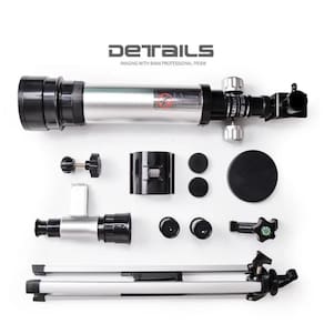 Características principais: Ampliação poderosa: alcance de 18x a 60x para observar os detalhes do espaço. Sistema óptico de refração: imagens claras e detalhadas para uma experiência impressionante. Diâmetro da objetiva: 50 mm. Distância focal: 360 mm (extensível até 180 mm). Lentes incluídas: H29 mm e H6 mm para ajustes de ampliação.