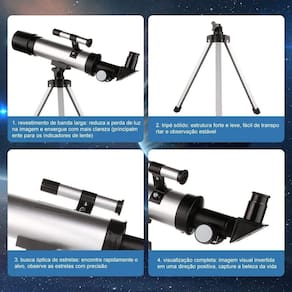 Telescópio astronômico portátil compacto ampliação 90x tripé ajustável crianças e iniciantes Nossa missão: oferecer produtos de alta qualidade, com preços acessíveis e a confiança que você merece. Bem-vindo a à nossa loja Conheça o telescópio astronômico de alta ampliação Características: Alta ampliação: telescópio refletor com duas lentes oculares 6 mm e 20 mm , proporcionando uma experiência visual nítida e detalhada, graças à sua ótica de vidro totalmente revestida e de alta transmissão. Fácil instalação: ideal para iniciantes e crianças, o telescópio pode ser montado rapidamente sem a necessidade de ferramentas, facilitando o uso desde o primeiro momento. Tripé resistente e rotação de 180: feito de alumínio leve e durável, o tripé de 38 cm é estável e fácil de transportar. Com rotação de 180, você tem flexibilidade total para explorar o céu. Incentivo ao aprendizado: perfeito para despertar o interesse das crianças pela astronomia, incentivando-as a explorar o universo enquanto desenvolvem bons hábitos de estudo e reduzindo o tempo na frente das telas. Conteúdo da embalagem: 01 telescópio f36050 01 lente 6 mm 01 lente 20 mm 01 lente ereta 1.5x 01 prisma 01 tripé ajustável de 38 cm 01 manual do usuário Em quanto tempo meu pedido será enviado É confiável Sim, somos uma loja oficial e todos os nossos produtos contam com , além da segurança oferecida pela plataforma. Os produtos possuem Sim, oferecemos uma de 30 dias em todos os nossos produtos. Caso haja qualquer problema, resolveremos da melhor forma possível. Faça sua pergunta e responderemos rapidamente