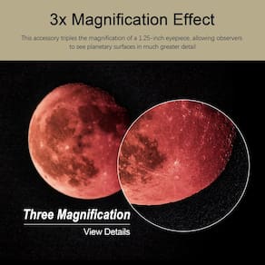 A lente de Barlow 1,25 " 4-element 3 x o poder de qualquer 1,25 " telescópio ocular. É um acessório ideal para alta potência elevada e observação planetária, bem como na Lua e planetária de imagens quando utilizado com um sistema solar a câmara ou câmara. Use este prático magnification-boosting Barlow para corpo a corpo na visão de Mars, de Saturno, e gigantesco planeta, ou para estudo sempre of the Moon em detalhe requintado. O impulso de energia fornecida pelo extra este é especialmente útil quando utilizado com curta distância focal da lente Barlow Telescopes que seria o contrário não ser capaz de alcançar a ampliação desejada com muito curta distância focal de. Os 3 x Barlow possui um design melhorado 4-element lente que preserva a nitidez e contraste do seu telescópio e telescópio de. Os elementos de lente multi-revestido com camada de São totalmente revestimentos, e edge-blackened para proporcionar o máximo de luz de rendimento e melhor contraste da imagem. - Potência de ampliação 3X: lente 3 x de 3 cm quando conectada Astromania qualquer ocular de telescópio de 3 cm; fornecerá uma ampliação três vezes maior que a da ocular; proporcionando um efeito mais claro para astrofotografia - Revestimento múltiplo: lentes de 4 elementos com design óptico multi-revestido tornam a imagem mais nítida e nítida, o que renderá imagens requintadas sem introduzir abberação cromática adicional; enquanto pode manter a reprodução de cores reais mesmo em condições de pouca luz - Compatibilidade universal: lente 3x barlow de 3 elementos Astromania de 3 cm com design de cilindro de 3 cm projetado com precisão; é compatível com a maioria dos telescópios e oculares; o cilindro rosqueado aceita filtros para fotografia de planetas e nebulosas - Estrutura de liga de alumínio: feito de alumínio premium com acabamento anodizado preto; este componente é usinado com precisão usando tecnologia CNC e pode ser utilizado por um longo tempo na maioria dos ambientes - Embalagem protetora premium: este barlow 3x está equipado com uma tampa antipoeira e uma bela caixa; a tampa de poeira meticulosamente projetada pode proteger a lente das partículas de poeira mais íntimas; garantindo um efeito óptico claro e sem falhas para cada observação