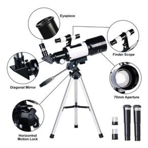 Modelo F30070M Sistema óptico Monocular (refrator) Ampliação máxima 150h Diâmetro da lente 70 mm Distância focal 300 mm Potência da luz F/4,28 Foco 0,98 Resolução 1,97 Formato de edição Azimut Comprimento mínimo do telescópio 300 mm Comprimento com distância máxima da lente à ocular 345 mm Altura do tripé 380 mm Teamtelescope Tripod Telescope Tripé Conjunto TrioptoA (x50, x15, x3, X1.5) Especificações: Cor: Diâmetro do telescópio Black + Silver: 90/3,54 “Comprimento do tubo: 350 mm./13,78" Comprimento do tripé: 375 mm./14,76 Altura do tripé: 390 mm./15,35 “Comprimento focal: 300 mm. Lente ocular F/4: H6 mm, mm. Ampliação: 150 x, 75 x, 22,5 x, 45 x, 50 x, 15 xCaracterísticas: 1. Tripé de alumínio para ajuste de altura. Construção em alumínio leve e durável, boa opção para iniciantes, componentes ópticos com revestimentos de vidro de alta transmissão para maior brilho e clareza. Rápido e fácil de montar. Seus suportes robustos são perfeitos para rastrear objetos no céu noturno, e o suporte equatorial dobrável de azimute alternativo é ideal para uso terrestre, bem como para visualização astronômica (terra) .4. Presente perfeito para crianças como uma ótima maneira de abrir o dia às maravilhas do universo. O pacote inclui: 1 x ocular telescópica 1 x H6 mm1 x mm. 1x1,5 x construções 1x3 x lente 1 x espelho diagonal e lente de viseira lunar, 1 x rolamento 1 x tripé 1 x tampa de lente 1 x controle de alvo e alça de bloqueio 1 x manual do usuário (INGLES)