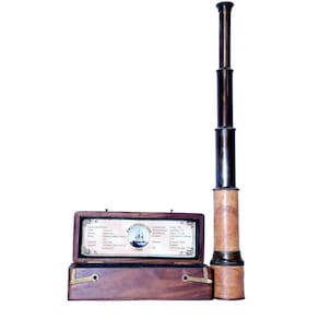 Telescope é uma obra-prima náutica totalmente funcional, lindamente montada em um tripé de madeira/latão. Este é funcional e feito para fins de decoração de sua casa real e escritório. O design de piso oferece estabilidade e conforto durante longas sessões de observação. Ajuste a altura de acordo com sua preferência e desfrute de horas observando as estrelas sem a necessidade de uma mesa ou suporte adicional. - Comprimento do tubo: 15" polegadas, ampliação: 25 X, material utilizado: latão sólido e madeira. Estilo antigo. Telescópio de alta qualidade com lindo estojo, lindo presente para todos. - O telescópio é uma obra-prima náutica totalmente funcional, lindamente montada em um tripé de madeira/latão. Este é funcional e feito para fins de decoração de sua casa real e escritório. - Um belo artesanato pode ser visto em sua fabricação e esses telescópios oferecem ampliação. Eles têm a mesma ampliação dos antigos. - O design do piso oferece estabilidade e conforto durante longas sessões de observação. Ajuste a altura de acordo com sua preferência e desfrute de horas observando as estrelas sem a necessidade de uma mesa ou suporte adicional. - Este telescópio de luneta portátil usa mecanismo de empurrar e puxar para focar objetos distantes. Você precisa retirar completamente todos os três tubos e empurrar lentamente o cano para dentro, enquanto olha pelo telescópio, até que o objeto desejado fique claro.