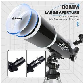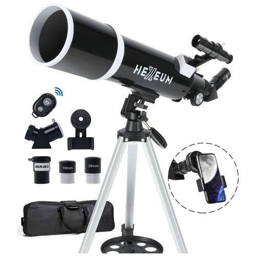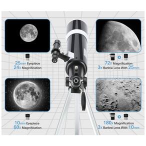 Excelente Telescópio Portátil: Equipado com Oculares de Alta Qualidade (25mm e 10mm) para Ampliações de 24X e 60X, Lente Barlow 3x e Buscador 5x24. Foco de 600mm e Abertura de 80mm para Imagens Brilhantes. Inclui Adaptador de Celular, Tripé de Alumínio e Controle Remoto Sem Fio.
