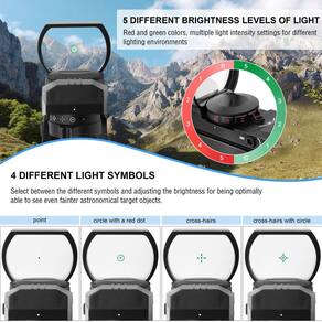 A versátil mira de reflexo de telescópio Finder Deluxe ajudará você a levar o seu telescópio em novas direções! Perfeito para usar durante a noite e durante o dia, a mira Finder Deluxe possui um LED vermelho para mira noturna e um LED verde mais brilhante para mirar em crepúsculo e na maioria das condições de luz do dia. As miras de reflexo são populares graças ao método intuitivo e não ampliado que usam para ajudar você a apontar seu telescópio com precisão. Dependendo da cor LED escolhida, um pequeno LED emite um padrão vermelho ou verde em uma janela de visualização que você olha para mirar o telescópio após um simples procedimento de alinhamento. Uma vez que o padrão é alinhado com o objeto alvo, você está pronto para vê-lo através do telescópio. Muitos astrônomos amadores usam um localizador ampliado e uma visão reflexiva para fornecer opções úteis para apontar seu telescópio com precisão. Com quatro diferentes padrões de retículo iluminados por LED vermelho ou verde para escolher, o EZ Finder Deluxe II torna o seu telescópio mais fácil do que nunca. Cinco níveis de brilho permitem que você adapte a intensidade do retículo às condições de visualização predominantes. Este dispositivo reflexivo para qualquer telescópio tem uma janela de visualização maior do que o Finder, tornando o Finder Deluxe mais fácil de usar, já que projeta o padrão escolhido em uma área mais ampla do céu ou horizonte. Parafusos de ajuste fino vertical e horizontal permitem alinhamento preciso com o telescópio principal. A estrutura toda em metal dá à vista Finder Deluxe Telescope Reflex a precisão e durabilidade exigidas por observadores sérios. A mira inclui um suporte de mira usinado para localizar cauda de andorinha que se encaixa na maioria dos telescópios ou nossas bases de montagem de cauda de andorinha (vendidas separadamente). Uma única bateria de célula de lítio CR2032 (não incluída). - O Finder projeta um pequeno padrão de retículo de LED vermelho ou verde em uma janela de visualização para que você possa mirar facilmente seu telescópio à noite ou durante o dia - O Finder Deluxe é uma mira reflexa sem ampliação que torna a mira do seu telescópio mais fácil e precisa do que nunca, dia ou noite - Inclui suporte localizador de cauda de andorinha que se encaixa na maioria dos telescópios Orion; Requer bateria de célula botão de lítio CR 2032 que não está incluída - Os parafusos de ajuste fino horizontal e vertical permitem o alinhamento preciso da mira reflexa com o telescópio - O Finder Deluxe possui uma grande janela de visualização; quatro padrões de retículo de mira diferentes para escolher; e cinco níveis de brilho