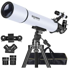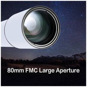 O telescópio SOLOMARK 80900 é equipado com uma abertura de 80 mm e lentes de vidro óptico totalmente revestidas, garantindo imagens brilhantes e claras. A grande abertura captura mais luz, enquanto as lentes de alta transmissão melhoram a passagem de luz e reduzem reflexos, proporcionando vistas detalhadas do céu noturno.