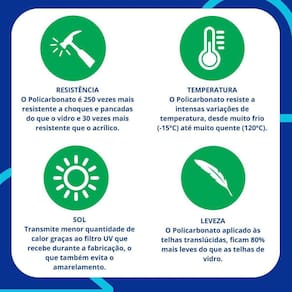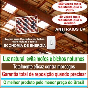Iluminação natural abundante Economia de energia Resistente a impactos, raios UV e intempéries Fácil instalação e baixa manutenção Elimina umidade que causam fungos e mofos Protege sua cobertura contra animais noturnos