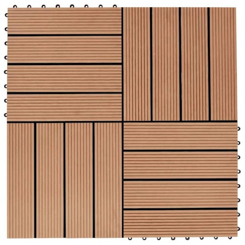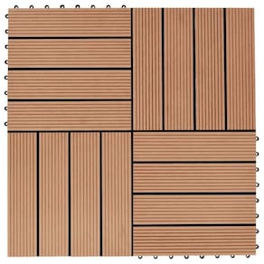 Este conjunto de ladrilhos de deck WPC, com um tamanho de ladrilho individual de 11,8 “x 11,8", consiste em 11 peças e cobre uma área de superfície total de 10,8 pés². Será ótimo para pátios, varandas, banheiros ou sua piscina ou área de spa