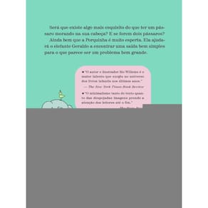 Nesta série de sucesso internacional, Geraldo e Porquinha vão buscar soluções simples para problemas que parecem muito difíceis. Será que existe algo mais esquisito do que ter um pássaro morando na sua cabeça? E se forem dois pássaros? Ainda bem que a Porquinha é muito esperta. Em Tem um pássaro na sua cabeça! , ela ajudará o elefante Geraldo a encontrar uma saída bem simples para o que parece ser um problema bem grande. Nesta nova aventura de uma das duplas mais simpáticas da literatura infantil, encontramos novos questionamentos e risadas em uma narrativa perfeita para os leitores pequenos. Indicado para leitores a partir de 4 anos.