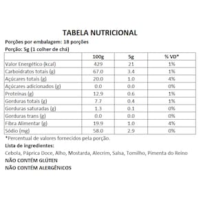 Páprica Doce, Alho, Sal iodado, Cebola, Curcuma, Orégano, Manjericão, Fécula de mandioca (utilizada como antiumectante natural)