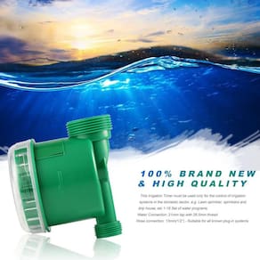 Características destacadas Este cronômetro de irrigação deve ser apenas para controlar sistemas de irrigação no setor doméstico, por exemplo, aspersores de irrigação, aspersores domésticos e gotejamento, etc. 1-16 Conjunto do programa de água Conexão de água: torneira de 21 mm com rosca de 26,5 mm Conexão de mangueira: 13 mm (1/2") - Adequado para todos os sistemas plug-in conhecidos Propriedades do produto: Tipo: temporizadores de jardim aquático Material: plástico Tipo de cronômetro: Outra conexão de água: 21 mm Meio de irrigação de rosca de 26,5 mm: Água doce Clear Valverde: válvula solenóide Temperatura da água: Pressões máximas de água de 40 graus : Máximo de 6 Bar/150 PSI Temperatura da água: Máximo 40 Grau médio de irrigação: água doce limpa Baterias: 2 pilhas AAA de 1,5 V Tamanho do material: plástico Peso do produto: cerca de 230 g Veja menos