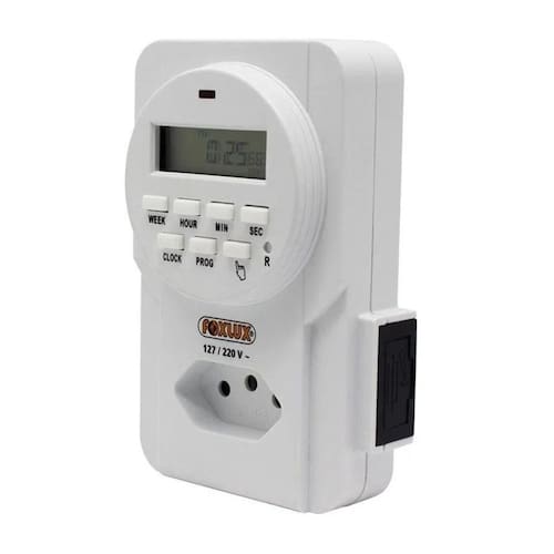 Temporizador Digital Para Tomada Fx Tbd Bivolt Foxlux Tensão Elétrica : Bivolt Acompanha Fio: Não Altura: 12cm Comprimento: 8cm Cor: Branco Corrente Elétrica: 10A da Fabricante: 12 Meses Largura: 8,5cm Uso Indicado: É utilizado para ligar e desligar automaticamente equipamentos em geral como: iluminação, calefação, ventilação, entre outros Especificações Modelo: FX-TBD 16.02 Produto: Temporizador Tipo: Digital Marca: Não Informado