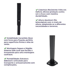 # Altura Ajustável: Pés telescópicos com 4 níveis de altura, adaptando-se a diferentes necessidades e terrenos.