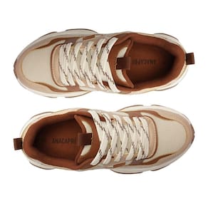Tênis da Anacapri, em nude, marrom e bege.. Com design de recortes modernos, possui aplicação de peças em napa nos tons de bege e marrom na biqueira, lingueta, laterais e calcanhar, com acabamento em pesponto delicado nos contornos.. O cabedal telado proporciona maior respirabilidade para o tênis.. Com novo solado robusto e tecnológico bege com detalhes em marrom.. Traz puxadores em fita de gorgurão aplicados na lingueta e na parte traseira, facilitando o calce..