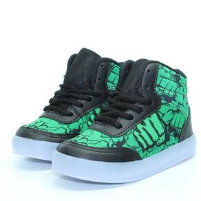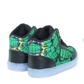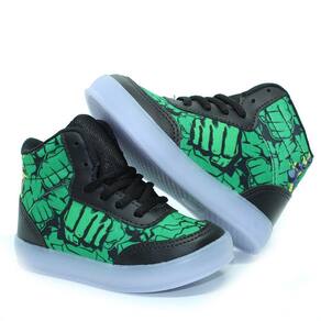 Tenis botinha cano médio com luzes de led Heroi Esmaga , que ascendem por impacto, desenvolvido na cor preto e verde , em material têxtil com corvin, dando maior resistência e conforto no caminhar das crianças, sola antiderrapante.