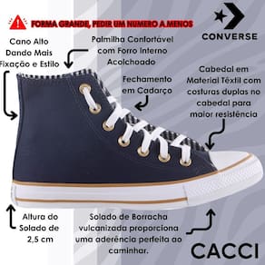 O tradicional Chuck Taylor All Star chega nesta coleção Play On Fashion com elementos da moda utilitária e do handmade, entregando mais atitude e estilo ao look. Vem confeccionado em tecido twill, com costuras duplas no cabedal para maior resistência, dois ilhoses laterais para uma transpiração adequada aos pés e forro interno acolchoado para maior conforto. O Patch Logo com assinatura Converse Chuck Taylor All Star é aplicado na parte interna dos canos, enquanto o logo Converse All Star é aplicado na heeltab do calcanhar. O solado de borracha vulcanizada garante mais aderência a cada passo.