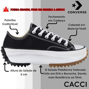 O Converse Run Star Hike é construído sobre uma plataforma robusta com solado bicolor e é confeccionado em tecido canvas de algodão tipo lona, com costuras duplas. O modelo possui dois ilhoses laterais para a transpiração adequada dos pés. Possui palmilhas SmartFOAM para melhor amortecimento. O solado plataforma tratorado, com aproximadamente 5 cm de altura (podendo variar conforme o tamanho do tênis), é feito em EVA e borracha, dando mais resistência ao tênis. O design é finalizado com o icônico Patch aplicado no calcanhar, com a assinatura do Chuck Taylor.