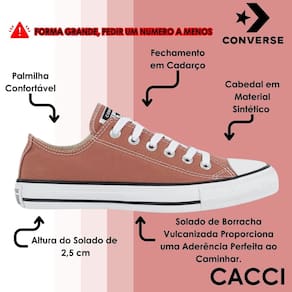 Dê um toque de autenticidade ao seu estilo com o Tênis Casual Street da Converse All Star! O design clássico que você ama, agora com cores sazonais e todo o conforto que você merece. Adquira o seu agora e leve o melhor do icônico Chuck Taylor para o seu dia a dia!