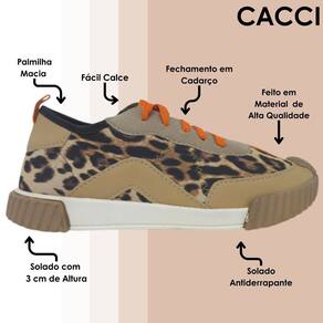 O Tenis Casual Cacci Tratorado Feminino 5005 apresenta um design moderno e contemporâneo, com solado tratorado que possui uma aparência marcante. Esse tipo de solado não apenas adiciona um toque estiloso, mas também oferece excelente tração em diferentes tipos de superfícies.