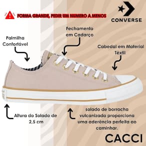 O tradicional Chuck Taylor All Star chega nesta coleção Play On Fashion com elementos da moda utilitária e do handmade, entregando mais atitude e estilo ao look. Vem confeccionado em tecido twill, com listras no forro interno acolchoado, costuras duplas no cabedal para maior resistência e dois ilhoses laterais para uma transpiração adequada aos pés. O logo Converse All Star é aplicado na heeltab do calcanhar e na tag do calcanhar. O solado de borracha vulcanizada garante mais aderência a cada passo.
