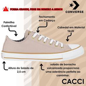 O tradicional Chuck Taylor All Star chega nesta coleção Play On Fashion com elementos da moda utilitária e do handmade, entregando mais atitude e estilo ao look. Vem confeccionado em tecido twill, com listras no forro interno acolchoado, costuras duplas no cabedal para maior resistência e dois ilhoses laterais para uma transpiração adequada aos pés. O logo Converse All Star é aplicado na heeltab do calcanhar e na tag do calcanhar. O solado de borracha vulcanizada garante mais aderência a cada passo.