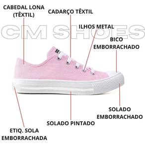 - Cabedal feito com material lona - Altura média do cano 12,5cm. - Solado feito com emborrachado pvc - Palmilha feita de eva de 3mm forrado - Lado interno com dois ilhos, para melhor respiração dos pés