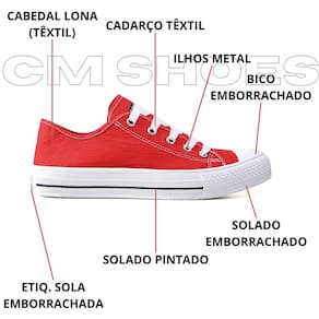 - Cabedal feito com material lona - Altura média do cano 12,5cm. - Solado feito com emborrachado pvc - Palmilha feita de eva de 3mm forrado - Lado interno com dois ilhos, para melhor respiração dos pés
