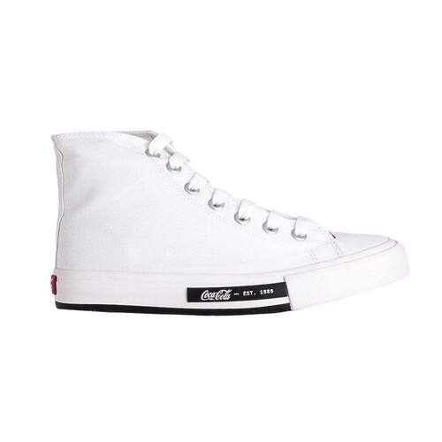 O Tênis Coca Cola Daytona Hi é o modelo ideal para quem deseja compor looks com estilo sem abrir mão do conforto no dia a dia. Confeccionado em têxtil respirável, os detalhes ficam por conta dos passadores de metal, além do símbolo da marca na sua lateral, que agrega o refinamento necessário para o modelo. O solado é de borracha antiderrapante, e a palmilha é em EVA personalizada e removível. Seu design é predominante na cor branca, e possui o logo da Coca em vermelho no calcanhar. Garanta seu look com o Tênis Coca Cola!