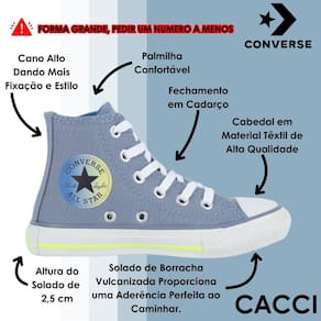 Equipado com fecho em cadarço, o All Star Hi Seasonal Plus permite um ajuste personalizado e seguro. Além disso, o design inteligente facilita calçar e tirar o tênis, proporcionando praticidade tanto para os pais quanto para as crianças.