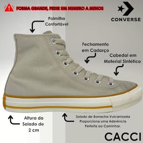 Na sua versão em cores sazonais, o icônico Chuck Taylor All Star mantém seu estilo atemporal com um toque renovado. Confeccionado em tecido canvas de algodão tipo lona, oferece durabilidade com costuras duplas no cabedal, garantindo resistência para o dia a dia. Os ilhoses laterais proporcionam ventilação adequada, enquanto o forro interno acolchoado eleva o conforto a cada uso. O clássico logo Converse All Star aparece tanto na heeltab do calcanhar quanto na tag da língua, reforçando sua autenticidade. Para completar, o solado de borracha vulcanizada assegura aderência e estabilidade em cada passo, tornando este modelo indispensável para quem busca estilo e versatilidade.