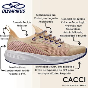 TECNOLOGIAS: ELEVA+ -Tecnologia exclusiva Olympikus, que explora o limite de expansão do EVA para alcançar máxima resposta, proporcionando o efeito trampolim, ou seja, absorvendo o impacto da passada e transformando essa energia em impulsão. Este EVA é leve e de baixa densidade, garantindo menor deformação e mantendo o conforto e a durabilidade.