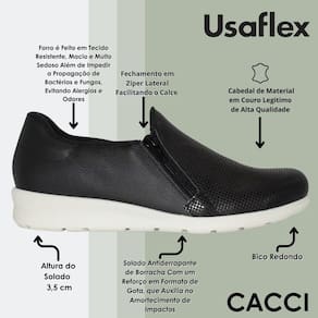 Sinta o conforto tão conhecido da Usaflex com a praticidade do Tênis Casual. Esse modelo com design discreto é confeccionado em couro e fechamento prático que proporciona calce fácil, adaptável ergonomicamente. O forro é feito em tecido resistente, macio e muito sedoso além de impedir a propagação de bactérias e fungos, evitando alergias e odores. Possui um solado antiderrapante de borracha com um reforço em formato de gota, que auxilia no amortecimento de impactos e ainda mais conforto. Aproveite!