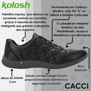Outro ponto positivo do tênis Kolosh casual é a palmilha Impulse, que oferece um excelente conforto ao caminhar, graças à espuma de memória inteligente que garante a absorção dos impactos. Já o solado com tecnologia Touch+ proporciona maior aderência e segurança na pisada, tornando-se uma opção ideal para quem busca um tênis flexível e resistente para o seu dia a dia ou momentos de lazer. Com um peso de apenas 0,514 kg, este tênis é uma excelente escolha para quem valoriza o conforto e a praticidade no calçado.