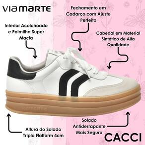 O tênis Via Marte é a escolha perfeita para quem busca estilo, conforto e um visual único. Seu solado triplo em flatform de 4cm proporciona estabilidade e conforto durante a caminhada. O design moderno é cuidadosamente elaborado, com costuras detalhadas que garantem um charme diferenciado.