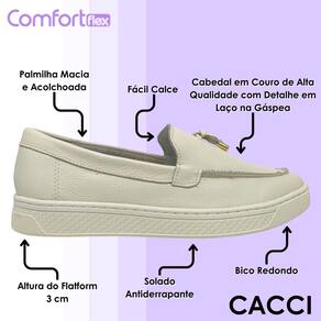 A palmilha macia e acolchoada garante conforto a cada passo, enquanto o solado flatform de três centímetros com acabamento antiderrapante oferece firmeza e segurança no caminhar. O calce fácil torna o uso mais prático no dia a dia, dispensando esforço para vestir.