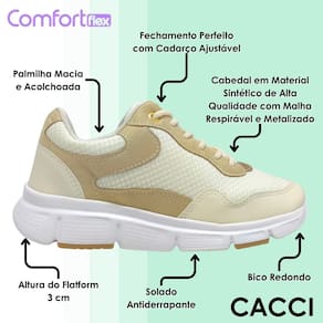 Este tênis feminino Comfortflex é a escolha certa para quem valoriza conforto, respirabilidade e design moderno no dia a dia. O cabedal é confeccionado em material sintético de alta qualidade com acabamento em malha respirável e variações com detalhes metalizados, garantindo frescor e charme em cada passo. O fechamento com cadarço ajustável proporciona ajuste ideal ao formato dos pés, oferecendo praticidade e segurança durante o uso prolongado.