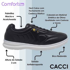A palmilha é super macia e acolchoada, proporcionando bem-estar desde o primeiro passo. Já o fechamento em cadarço elástico torna o calce rápido e prático, dispensando amarrações e se moldando com facilidade aos pés. O solado de três centímetros possui base antiderrapante que garante segurança em diversos tipos de piso, enquanto o bico arredondado complementa o conforto com um ajuste suave e natural para os dedos.