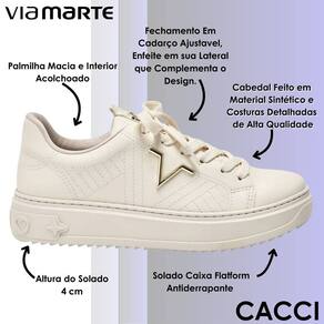 O tênis Via Marte é a escolha perfeita para quem busca estilo, conforto e um visual único. Seu solado Flatform proporciona estabilidade e conforto durante a caminhada. Seu design moderno e cuidadosamente elaborado, com costuras detalhadas, garante um charme diferenciado. Conta também com um belo enfeite em sua lateral que complementa o design único do tênis. Além disso, o interior acolchoado e os materiais de alta qualidade asseguram o máximo conforto aos seus pés. O tênis Via Marte é a opção versátil e elegante que oferece estilo e bem-estar em todas as ocasiões.