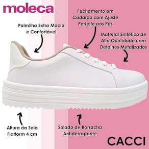 Para quem valoriza conforto sem abrir mão do estilo, o Tênis Moleca é a escolha ideal para o dia a dia. Com um visual moderno e discreto, ele combina com tudo e traz aquele toque versátil que se adapta facilmente a diferentes ocasiões. Seu acabamento em material de alta qualidade, com detalhes discretamente metalizados, dá ao modelo uma aparência sofisticada, mantendo a leveza e praticidade que a rotina pede. É aquele tipo de calçado que você pode usar com jeans, saias, vestidos ou peças mais casuais, sempre garantindo um look atual e descomplicado.