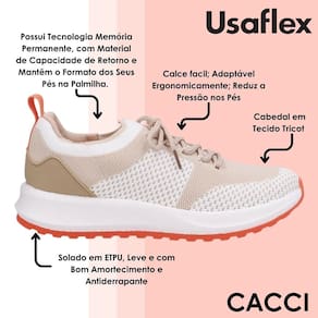 O tênis Usaflex foi desenvolvido para quem busca conforto absoluto e leveza em cada passo. Seu design moderno e funcional oferece um calce fácil, adaptando-se ergonomicamente aos pés e reduzindo a pressão durante o uso. Ideal para o dia a dia, ele proporciona estabilidade e bem-estar, mesmo após longos períodos em pé ou caminhadas.