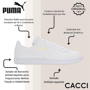 O modelo com design casual e moderno, possui cabedal em poliéster, fechamento em cadarço, solado emborrachado e resistente e logo Puma aplicado na lateral.