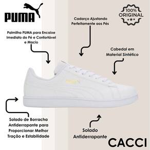 O modelo com design casual e moderno, possui cabedal em poliéster, fechamento em cadarço, solado emborrachado e resistente e logo Puma aplicado na lateral.