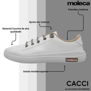 A palmilha macia e o solado flexível oferecem suporte e amortecimento adicionais, permitindo uma experiência de uso confortável durante todo o dia. Seja para um passeio descontraído com amigos ou para uma atividade do dia a dia, este tênis Moleca é a escolha perfeita para quem busca estilo, conforto e praticidade em um único calçado.