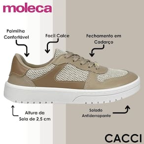 O tênis feminino Moleca é confeccionado com material sintético de alta qualidade. Seu salto rasteiro em 3cm auxilia numa passada firme e segura. A palmilha macia garante máximo conforto e bem-estar aos pés. Seu Bico redondo acrescenta um toque contemporâneo, enquanto o material externo sintético proporciona resistência e facilidade de manutenção. O fechamento em cadarço permite ajuste personalizado, oferecendo segurança e comodidade durante o uso.