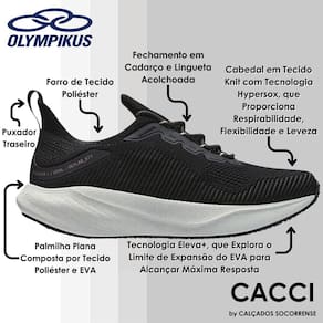 TECNOLOGIAS: ELEVA+ -Tecnologia exclusiva Olympikus, que explora o limite de expansão do EVA para alcançar máxima resposta, proporcionando o efeito trampolim, ou seja, absorvendo o impacto da passada e transformando essa energia em impulsão. Este EVA é leve e de baixa densidade, garantindo menor deformação e mantendo o conforto e a durabilidade.