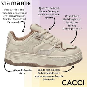 Esse tênis Via Marte foi desenvolvido para quem busca estilo moderno sem abrir mão do conforto. Ele é produzido com materiais leves, possui interior em tecido poliéster que oferece toque macio e agradável e sua palmilha extra macia garante conforto prolongado em qualquer ocasião. O cabedal conta com tecido em mesh respirável que favorece a circulação de ar, mantendo os pés sempre arejados. O forro e o corte envolvem os pés sem apertar, proporcionando ajuste confortável durante o uso diário. O solado flat de 4cm tem acabamento emborrachado bicolor que garante ótima aderência e segurança ao caminhar, além de valorizar ainda mais o visual do calçado. Um modelo versátil, ideal para acompanhar desde momentos casuais até composições mais estilosas, combinando facilmente com diferentes peças do seu guarda-roupa.