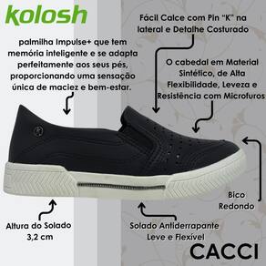 Sinta a leveza a cada passo com a palmilha Impulse+ que tem memória inteligente e se adapta perfeitamente aos seus pés, proporcionando uma sensação única de maciez e bem-estar. Além disso, o calce fácil com elásticos nas laterais otimiza o seu tempo e facilita o calce, perfeito para quem busca praticidade no dia a dia. Já a sola caixa com 3,2 cm, consagrada pela marca Kolosh, oferece amortecimento e estabilidade, garantindo segurança e conforto em cada pisada.