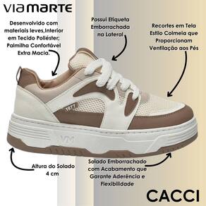 Esse modelo Via Marte combina estilo e conforto em um design moderno que se adapta a diversas ocasiões. Desenvolvido com materiais leves e interior em tecido poliéster, ele garante um calce agradável e macio, enquanto a palmilha foi pensada para oferecer conforto extra durante todo o dia. Seu cabedal traz recortes em tela estilo colmeia, que permitem ventilação aos pés, mantendo a sensação de frescor mesmo em longos períodos de uso. O solado emborrachado com altura de quatro centímetros proporciona estabilidade e flexibilidade, além de garantir ótima aderência em diferentes superfícies, oferecendo segurança a cada passo. Um detalhe que valoriza ainda mais o visual é a etiqueta emborrachada lateral, que reforça a identidade do modelo e adiciona um toque urbano ao design.