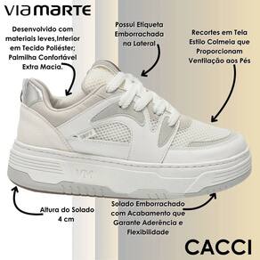 Esse modelo Via Marte combina estilo e conforto em um design moderno que se adapta a diversas ocasiões. Desenvolvido com materiais leves e interior em tecido poliéster, ele garante um calce agradável e macio, enquanto a palmilha foi pensada para oferecer conforto extra durante todo o dia. Seu cabedal traz recortes em tela estilo colmeia, que permitem ventilação aos pés, mantendo a sensação de frescor mesmo em longos períodos de uso. O solado emborrachado com altura de quatro centímetros proporciona estabilidade e flexibilidade, além de garantir ótima aderência em diferentes superfícies, oferecendo segurança a cada passo. Um detalhe que valoriza ainda mais o visual é a etiqueta emborrachada lateral, que reforça a identidade do modelo e adiciona um toque urbano ao design.