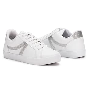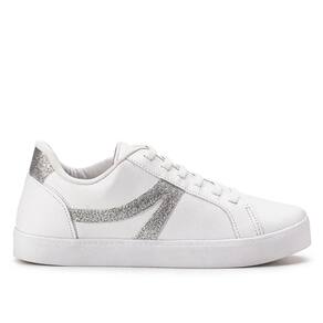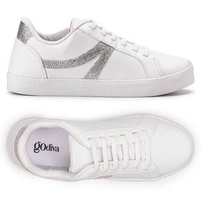 O Tênis Godiva Casual Feminino Branco Bronze possui design moderno e despojado, perfeito para compor os mais divertidos looks. Fabricado em material sintético de alta qualidade, seu cabedal é todo na cor branca, com detalhe na cor prata, com acabamento em glitter, na lateral e na traseira, possui cadarços como forma de ajuste, também conta com forro interno revestido por material têxtil, sua palmilha é macia, composta por espuma e seu solado é emborrachada e possui altura elevada.