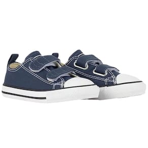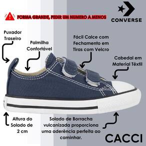 O clássico Chuck Taylor All Star nesta versão kids é confeccionado em tecido lona de algodão e vem em diversas cores. O tênis possui duas tiras colantes na parte superior para fechar e puxador traseiro para facilitar o calçar.
